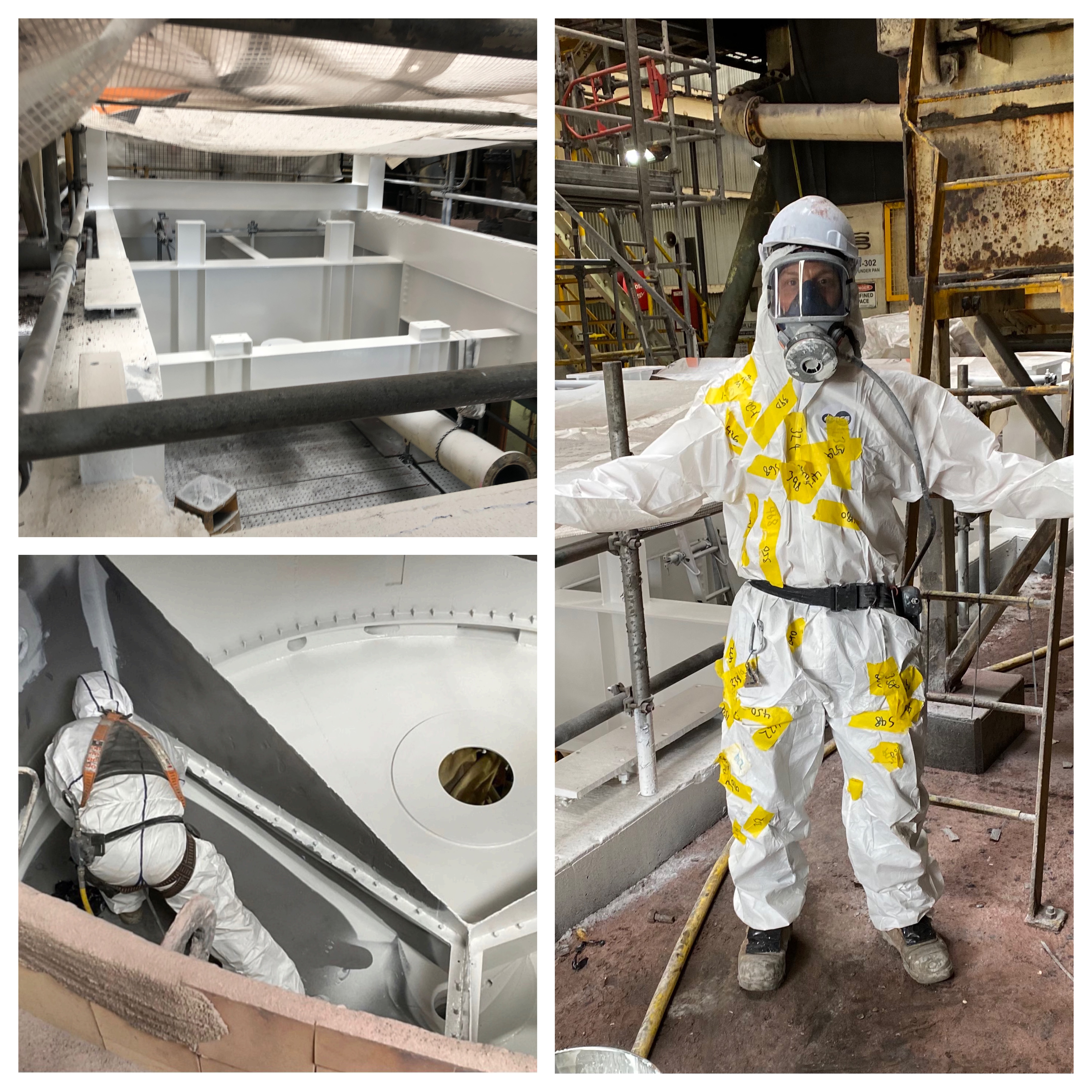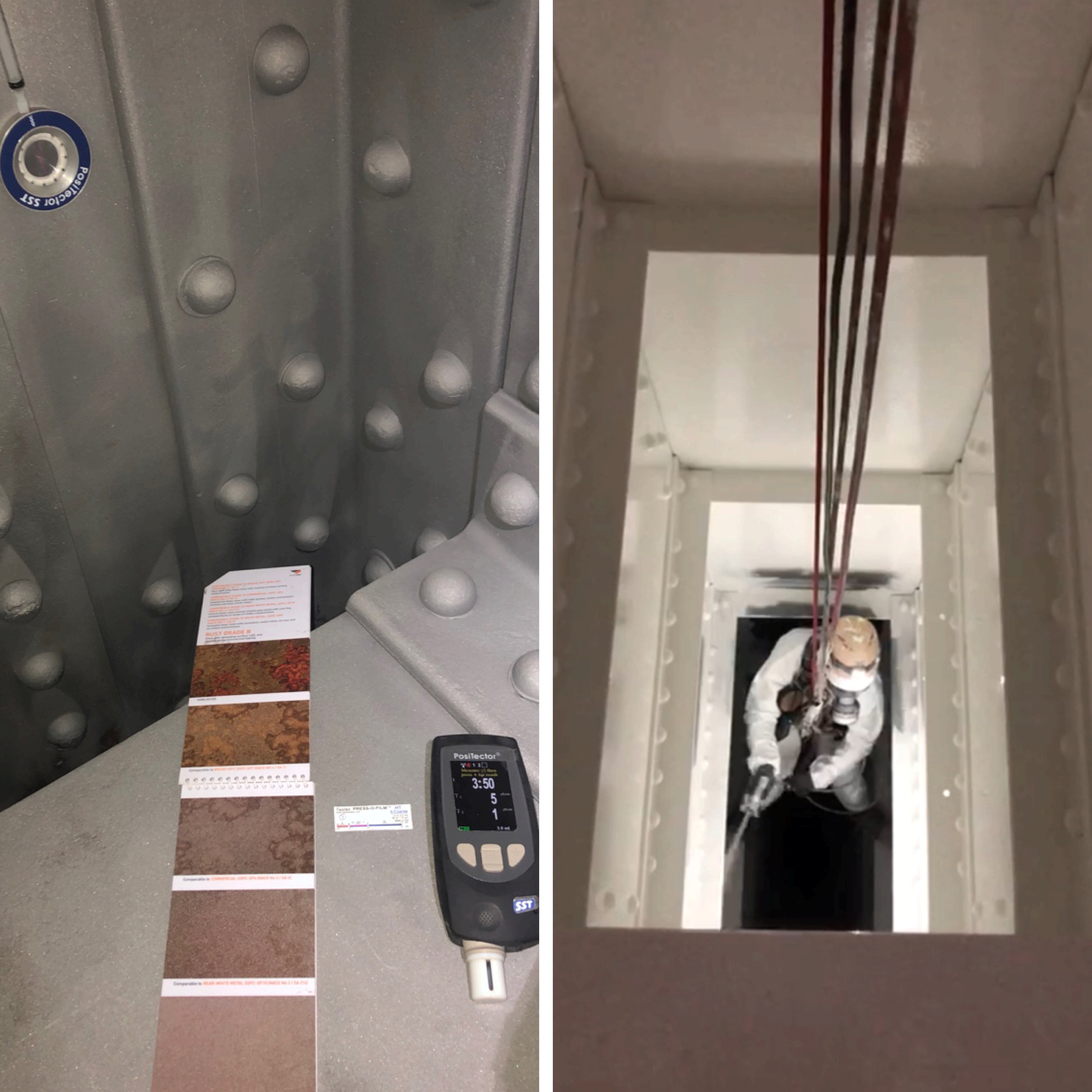 Enter confined spaces via rope access. Inspect abrasive blasting and apply new coating system.