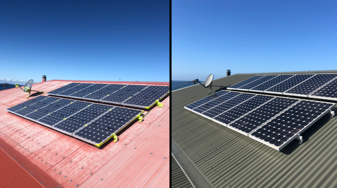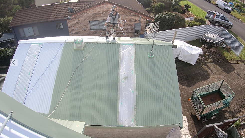 A large roof transformed from a dark to a light colour to reduce thermal impact in summer. Speciality paint applied for safe use of tank water.
